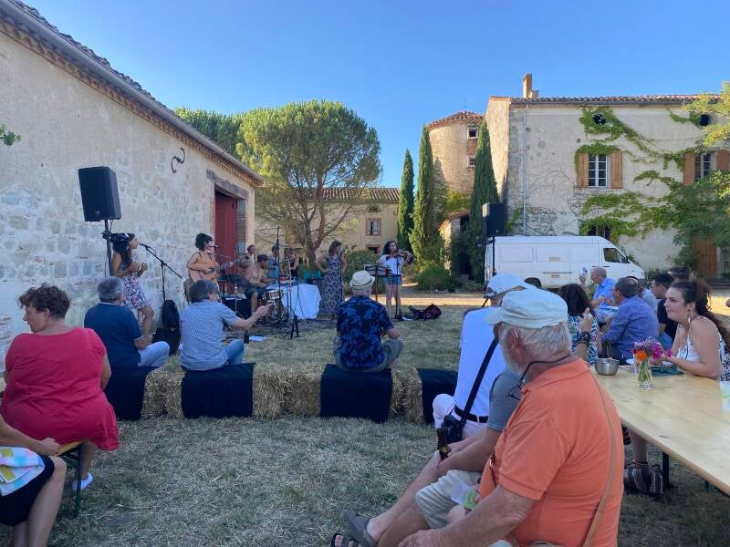 That same afternoon, we connected with the spirit of the place in a deeper way. We were invited to a garden party next to the carefully restored old barn: a multipurpose space with a stage, bar, sofas, tables, a children's corner, and a small shop selling preserves made with garden produce, run by a full-time dedicated staff member. The concert—open-air, biergarten-style, with views of the Pyrenees—was given by two members celebrating ten years of life together. An open-to-the-public event that brought together around fifty people from neighboring villages in a warm and festive atmosphere, filled with multicultural music and good conversation.